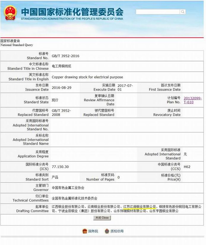 該標準由江潤銅業(yè)、江西銅業(yè)、云南銅業(yè)等七家單位共同起草制定,這是公司繼參與起草修訂《電工用銅線坯單位產(chǎn)品能源消耗限額》、《電工圓銅線》、《鍍錫圓銅線》、《電工軟銅絞線》、《鍍銀軟圓銅線》國家標準后,又一次參與國家標準的起草修訂工作。