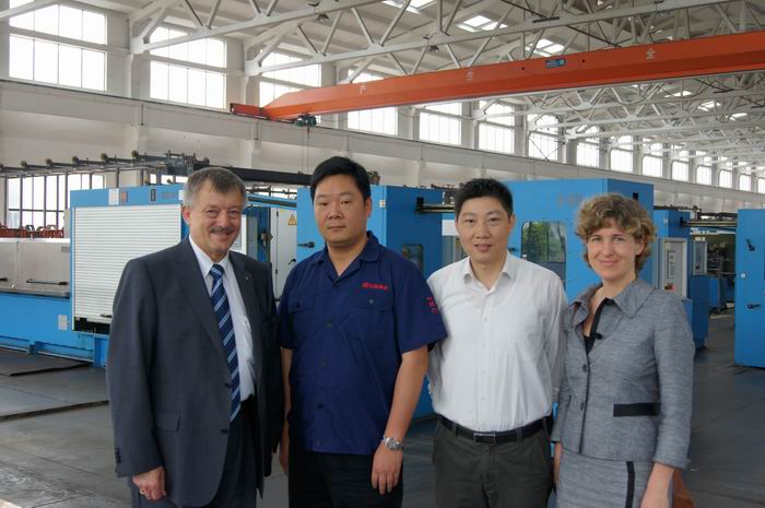 注:尼霍夫機(jī)械制造有限公司創(chuàng)始于1875年,作為歷史悠久的電纜設(shè)備制造廠商,在拉線、電鍍和束線等領(lǐng)域均處于世界領(lǐng)先地位。NIEHOFF與江潤銅業(yè)之間的合作源遠(yuǎn)流長,始于九十年代初,國內(nèi)首家引進(jìn)了M85高速連續(xù)退火大拉設(shè)備,因?yàn)樗募夹g(shù)、品質(zhì)、服務(wù)以及德國工業(yè)的嚴(yán)謹(jǐn)作風(fēng),促使我們從2000年起分批引進(jìn)了120多臺套系列拉線、電鍍錫、電鍍銀、束線等先進(jìn)裝備。二十年的歷程,二十年的風(fēng)雨,我們攜手同行、共同成長。新型號設(shè)備的試用、使用意見反饋、改進(jìn)完善,我們之間一直在進(jìn)行著技術(shù)交流和互動。2004年,我們引進(jìn)了國內(nèi)首條WPT4000鍍錫生產(chǎn)線,經(jīng)雙方工程師的通力合作,使92年產(chǎn)M85和新鍍錫機(jī)聯(lián)動生產(chǎn)成功,創(chuàng)造了亞洲地區(qū)首條拉線、電鍍聯(lián)動生產(chǎn)線。